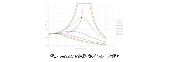 根据使用FHA方法得出的增益计算公式以及为STEVAL-LLL009V1评估套件半桥LCC谐振转换器选择的LCC参数,我们得出增益与归一化频率的关系曲线,如图5所示。
