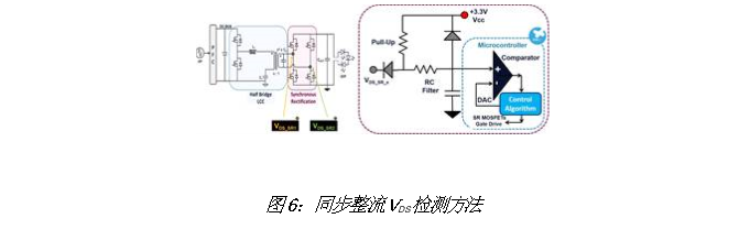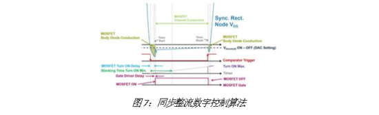 当漏源电压(VDS)高于设定阈值(通过MCU DAC外设设置的Vthreshold_ON – OFF)时,比较器输出(上升沿)重置MCU TIMER外设,并停止向相应的同步整流栅极驱动器发送脉冲,如图所示。 图7。