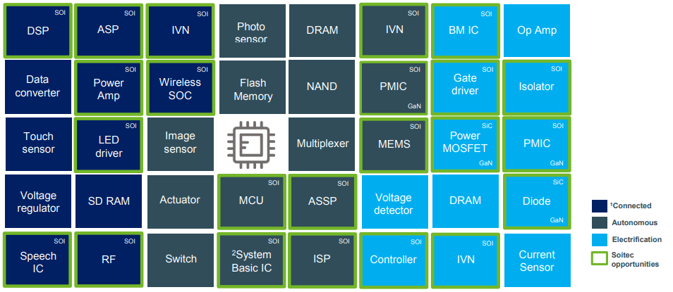 面向汽车领域的产品包括用于高级驾驶员辅助系统(ADAS)和多媒体、MCU、雷达传感器前端模块的FD-SOI,以及针对栅极驱动器、D类放大器、收发器、电池管理系统的Power-SOI,还有提供用于成像与传感领域的Imager-SOI。除了SOI(绝缘衬底硅)以外还有其他新的产品,比如用于滤波器应用的压电优化衬底POI,以及硅基氮化镓。