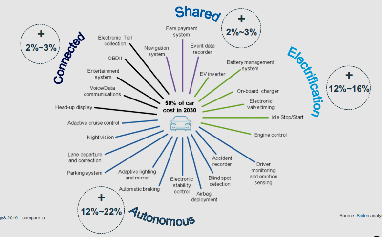 与优化衬底相关的汽车半导体器件 从2019年到2020-2022年,再到2022年及以后,汽车行业会经历三代发展,半导体器件含量将不断增加。这些增长不仅是使用衬底面积方面的增长,新的应用种类以及新的芯片种类的应用也将增加。