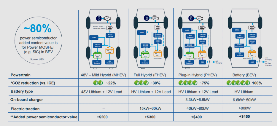 Bernard Aspar还说:“在全电动汽车(BEV)中,功率半导体的附加值是功率MOSFET(如SiC),在不同汽车电子要求的xEV动力总成类型中都将不断增加,尽管这些类型电动汽车的二氧化碳减排效果不一,电池类型不同,有或没有车载充电器及电力牵引。”