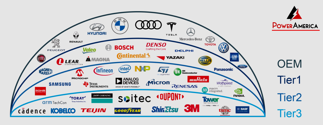 半导体是汽车行业的供应链上游的上游,中间还有Tier 1,而半导体行业中还有细分,紧接Tier 1的上游是芯片设计及制造厂商(有的仅设计芯片,有的设计制造兼而有之);再往上是芯片代工厂商,为芯片设计厂商提供各种工艺来制造芯片;代工厂商还有上游,就是提供生产芯片的原材料(晶圆、衬底等)的供应商,我们现在讲的硅、碳化硅(SiC)、氮化镓(GaN)等在这一环节就已经成形了;芯片是在晶圆上切割出来片芯,再经过封装就成为了芯片,也就是集成电路(IC)。