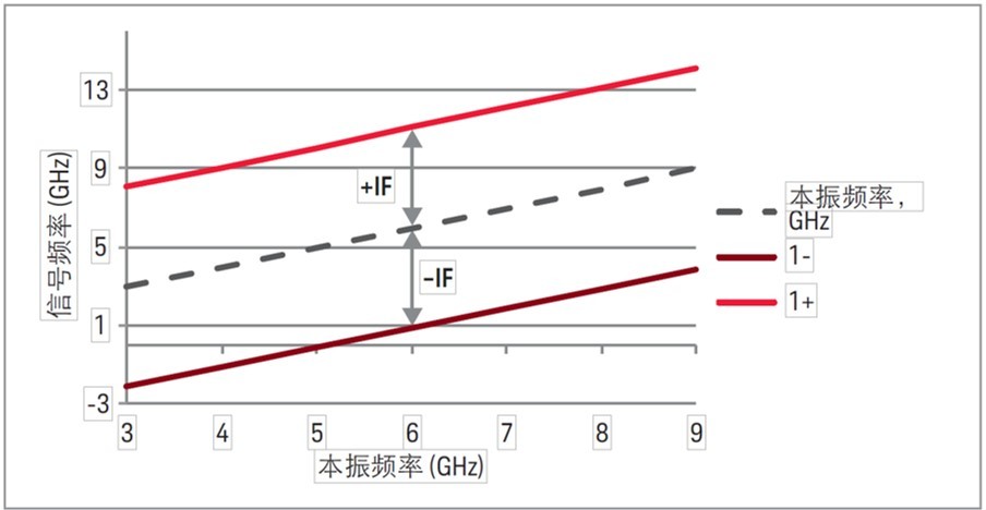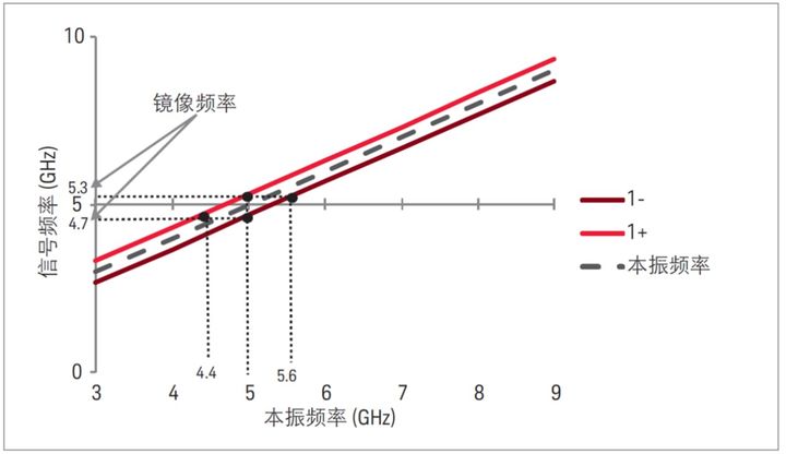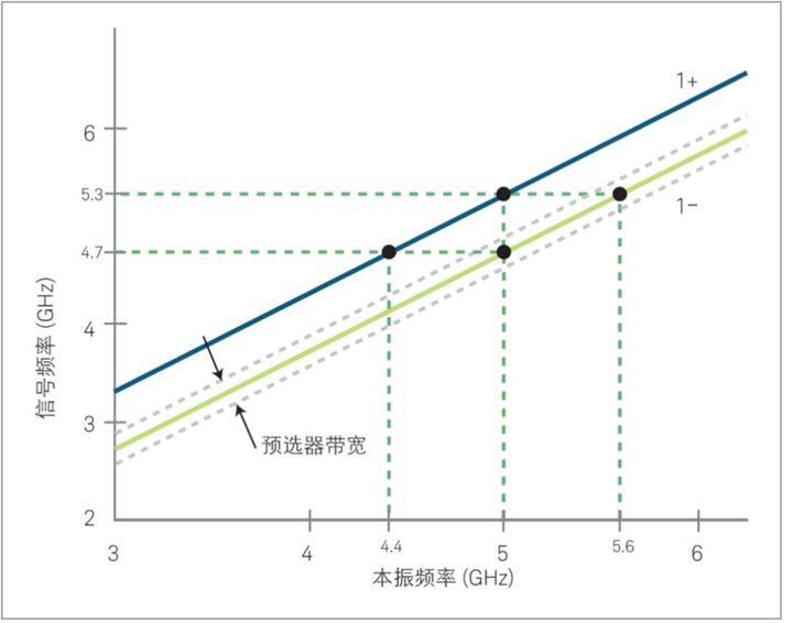 使用这种混频解决方案有可能使不同频率的信号显示在同一点上,即在同一本振频率处产生响应。如图 1-4 所示,当本振频率为 5 GHz 时,频率为 4.7 GHz 和 5.3 GHz 的输入信号都能在中频处产生响应,这些信号的频率被称为镜像频率,它们之间也是相隔 2 倍中频。
