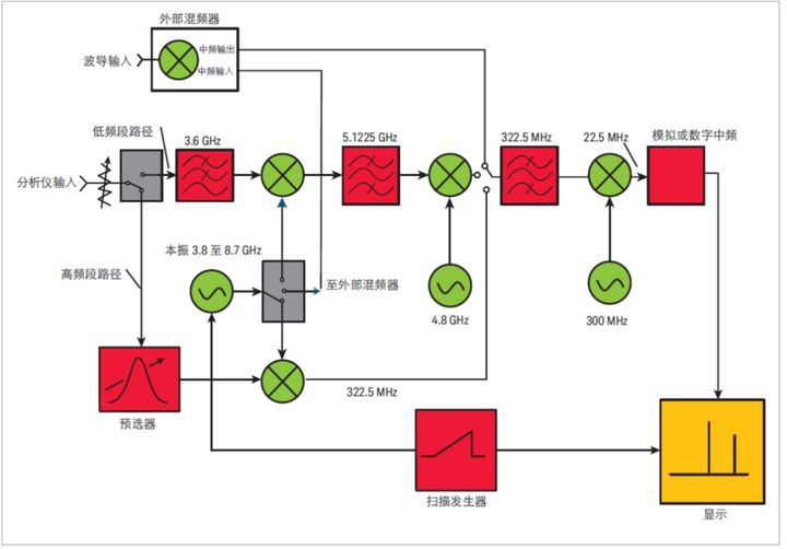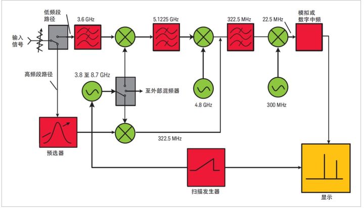 在下面实例中我们将使用这个中频值。总之,对于低于 3.6 GHz 的低频段,第一中频是 5.1 GHz;对于高频段,我们切换第一中频至 322.5 MHz。在图 1-1 中,第二个中频是 322.5 MHz,所以想要分析仪调谐至较高频率范围时,我们需要做的是将信号旁路绕过第一个中频。