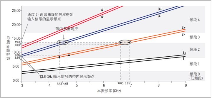 由 3+ 和 3− 调谐曲线响应所产生的显示信号被称作带内多重响应。由于它们出现在本振调谐为 4.63 GHz 和 4.43 GHz 时,它们会在屏幕上产生虚假响应,并且看起来像是 8.96 GHz 和 8.56 GHz 的真实信号。