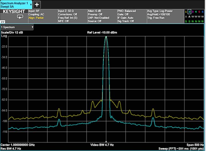 如果频偏加倍,则边带电平电压也必然加倍,亦即增大了 6 dB 或 20 log(2)。所以,当使用本振较高的谐波混频时,分析仪测量非常接近且幅度不同的信号的能力将下降。图 1-11 显示了一个 5 GHz 基波混频信号和一个 4 次谐波(20 GHz)混频信号的相位噪声的差异。