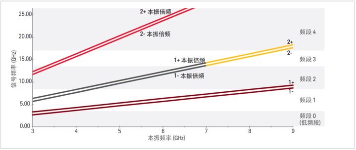 图 1-7. X 系列分析仪谐波频段,使用本振倍频