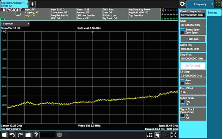 在一些老式频谱仪中,每一个谐波频段的显示平均噪声电平的变化非常明显。新型是德科技频谱分析仪采用一种双平衡、图像增强的谐波混频器,使谐波数增多造成的变频损耗的增量减到最小。因此,DANL“阶梯式”步进效果的情况已被较高频率处的缓慢坡度所取代,如图 1-10 所示。