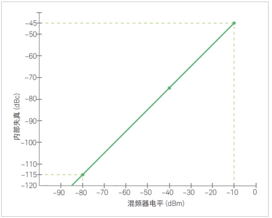 从图中曲线可以看出,混频器上的-10 dBm 信号将产生 -45 dBc 的二次谐波失真分量。现在,我们将分析仪调谐到二次谐波 6 GHz 上。如果预选器具有 70 dB 的抑制能力,则混频器上的基波将降低到 -80 dBm。图 1-12 表明,当混频器上的信号为 -80 dBm 时,内部产生的失真是 -115 dBc,这意味着比 -80 dBm 的新基波电平低 115 dB。这使谐波的绝对电平为 -195 dBm。所调谐的基波与所调谐的内部生成的二次谐波之间相差 185 dB!