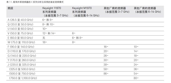 表 7-1 显示了 X 系列频谱分析仪在不同的毫米波段采用的谐波混频模式,例如Keysight M1970 系列和早期的 11970 系列外部混频器。为了获得易用性和较低的变频成本,M1970 系列混频器提供一个 USB 连接,可用于自动识别混频器的型号和序列号,通过执行本振调整来优化性能,并将混频器的变频损耗表下载到分析仪的存储器中。如果已知其他厂商混频器的变频损耗及频率,您也可以使用它。其他厂商制造的某些外部混频器需要一个偏置电流将混频器的二极管设置到合适的工作点。X 系列频谱分析仪能够通过前面板上的外部混频器端口提供高达 ± 10 mA 的直流电流,从而提供上述偏置,并且保持测量设置尽可能简单。