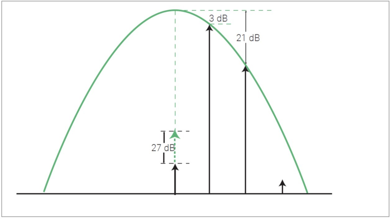 考虑图 1-13 所示的情况,分析仪被调谐到较低的失真分量,且两个基音相隔为预选器带宽的一半。此时,较低频率的测试音位于预选器通带的边缘且衰减量为 3 dB;较高频率的测试音位于低频失真分量之上,比其高出一个等于预选器带宽的范围,衰减量约为 21 dB。由于我们调谐到低频失真分量,故在这个频率上产生的内部失真相对于 V1(2 x 3 dB = 6 dB)的衰减降低了 2 倍,而且几乎与 V2(21 dB)的衰减速度一样快。动态范围的改善量总共为 6 dB + 21 dB,即 27 dB。与二次谐波失真的情况一样,还必须考虑分析仪的本底噪声。对于靠得很近的测试音,使用预选器没有什么改善,在确定动态范围时就如同没有使用预选器一样。