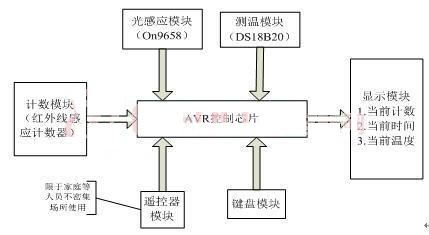 计数模块我们采用红外线感应计数器,该种计数器大体分为两种,其中一种是对射式,另一种是反射式。对射式是利用一个发射头一个接收头,中间如果有物体通过就遮挡一下光线,输出一个脉冲给计数器,计数一次;反射式是发射头和接收头做在一块成为一个红外探头,当红外探头前有物体出现就把发射头的红外线反射给接收头,探头输出一个计数脉冲给计数器,计数一次。由于对我们这个系统的应用场合对射式要比反射式计数方面要准确些,所以采用对射式。我们把红外线感应计数器的脉冲输出端直接连接在单片机的I/O口上进行计数处理,计数结果同时要在液晶屏显示器上显示一下。