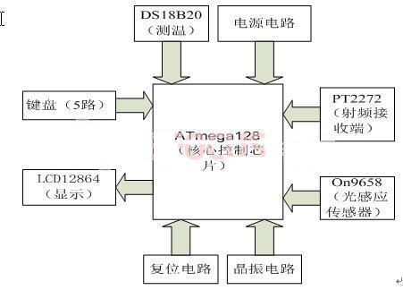 我们选用基于ATmega128的硬件平台,资源配置方面:带有至少5路按键,带有测温模块(DS18B20芯片),以及ST7920为驱动芯片的LCD12864字符液晶显示器,光敏三极管ON9658,无线通信收发芯片PT2262和PT2272,如果这些资源没有的话,留有单片机扩展口,到时我们自行扩展也可。