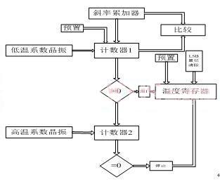 DS18B20测温原理如下图所示。图中低温度系数晶振的振荡频率受温度影响很小,用于产生固定频率的脉冲信号送给计数器1.高温度系数晶振随温度变化其振荡率明显改变,所产生的信号作为计数器2的脉冲输入。计数器1和温度寄存器被预置在-55℃所对应的一个基数值。计数器1对低温度系数晶振产生的脉冲信号进行减法计数,当计数器1的预置值减到0时,温度寄存器的值将加1,计数器1的预置将重新被装入,计数器1重新开始对低温度系数晶振产生的脉冲信号进行计数,如此循环直到计数器2计数到0时,停止温度寄存器值的累加,此时温度寄存器中的数值即为所测温度。下图中的斜率累加器用于补偿和修正测温过程中的非线性,其输出用于修正计数器1的预置值。