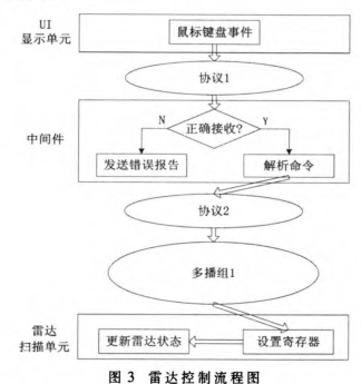 雷达控制流程如图3所示。协议1是UI显示单元和中间件控制命令协议,协议2是中间件与扫描单元控制命令协议。