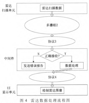 数据处理流程如图4所示。其中,协议3为雷达与中间件的数据协议,协议4为中间件与UI显示单元的数据协议。雷达扫描原始数据预先已经经过FPGA处理,这里的雷达数据是极坐标雷达扫描线数字信号。中间件通过加入多播组2从而接收到完整的扫描数据。由于UI显示直角坐标数据较为通用和方便,所以中间件一个重要功能是坐标转换。
