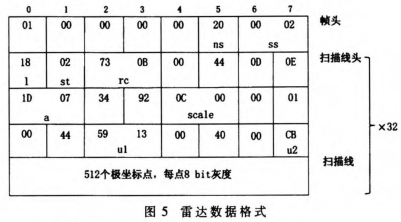 雷达控制命令包括开关机、增益调节、量程调节、海杂波抑制调节、雨雪抑制调节、扫描单元转速等。UI显示单元通过响应鼠标或触摸屏事件发送命令给中间件;中间件解析并根据协议2重新合成报文发送至多播组1;扫描单元接收并解析多播组的命令,设置移位寄存器,从而改变雷达运行状态。