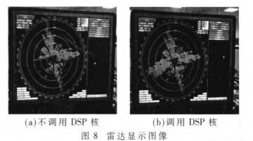 实验效果图如图8、图9所示,图8(a)和8(b)分别为不调用DSP核和调用DSP核的雷达显示图像,可以看出调用DSP核时解决了丢包现象,雷达图像左下再无空数据。图9(a)和9(b)分别为不调用DSP核和调用DSP核时的CPU占有率,rd_demeon即为中间件软件。可以看出,不调用DSP核时中间件的CPU占有率高达近40%,而调用DSP核后将中间件的CPU占有率降低到20%,节约了宝贵的CPU资源。