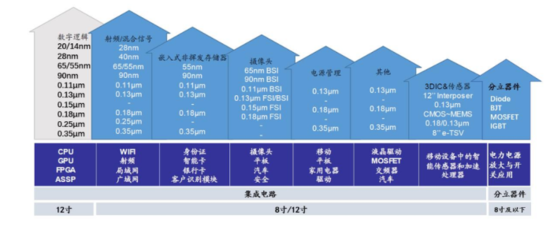 不同尺寸产品、工艺制程及主力晶圆尺寸: