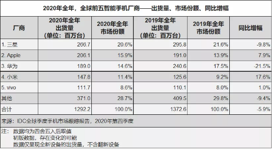 IDC发布的2020年全球手机数据显示,vivo全年智能手机出货量超1.1亿台,占据了8.6%的市场份额,是Top5手机厂商中唯二保持同比增长的国产手机厂商。