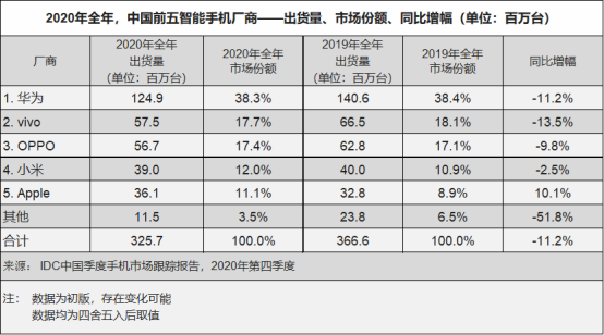 在国内市场,vivo的表现就更加亮眼了,IDC数据显示,2020年全年vivo在中国智能手机市场的出货量高达5750万台,占据了17.7%的市场份额,是市场份额仅次于华为的手机厂商。