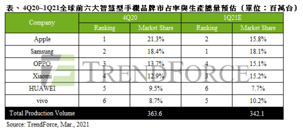 OPPO(包含OPPO、一加、realme)、小米及vivo在2020年第四季的生产量分别为5,000万部、4,700万部及3,150万部,分别拿下第三、第四及第六名。2021年第一季度这三个品牌维持乐观的生产目标,积极布局海内外市场。但目前晶圆代工产能紧缺,限制了这三个品牌在生产总数的增长表现。