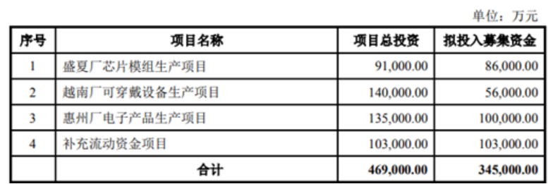 环旭电子表示,是次募资拟用于盛夏厂芯片模组生产项目(8.6亿元)、越南厂可穿戴设备生产项目(5.6亿元)、惠州厂电子产品生产项目(10亿元)和补充流动资金(10.3亿元),项目总投资46.90亿元。