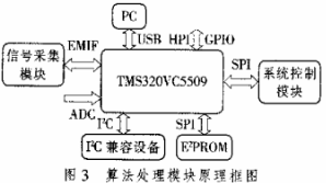 本模块主要由核心处理器TMS320VC5509组成,它是TI推出的新一代低功耗高性能16bit定点数字信号处理器,其工作主频可达到200MHz,周期效率达到了C54X的2倍,且功耗只有C54X的1/6。它还提供了丰富的外设资源,其中包括1个外部存储器接口,实现了和异步存储器如EPROM,SRAM以及同步存储器等外部设备的无缝连接;3个全双工的高速多通道缓冲串口,DSP通过McBSP可以与其他DSP,编解码器等相连;另外的外设有通用串行总线,实时时钟,看门狗定时器,I2C总线,10bitADC,多媒体卡控制器和通用输入输出接口等。在考虑充分利用DSP的外设资源的基础上,笔者设计了外扩功能完善的硬件平台,原理框图如图3所示。