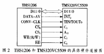 模块采用TI公司的A/D转换器THS1206。THS1206是1个可编程12 bitCMOS低功耗4通道同步采样A/D转换器,最高转换速度是6 Msample/s,最大功耗216mW,其速度、分辨率、带宽都非常适合较宽的应用方向。THS1206不需任何额外器件便可与DSP系统非常方便地进行连接。THS1206内有2个12bit控制寄存器(0,1),用来控制其工作方式(具体的工作方式可查阅参考文献[1])。一个完整的16 byte深先进先出(First InFirst Out,FIFO)存储器允许数据缓冲存储,减少了DSP中断的次数,提高了DSP的工作效率。内部参考电压范围为1.5V和3.5V。THS1206和TMS-320VC5509的具体硬件连接图如图2所示。