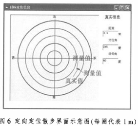 在上述硬件模块及相应软件的基础上,对整个系统进行了调试。在已完成的平台上实现了自适应参量模型法定向定位算法,进行了消声室模拟缩比定向试验,俯仰角引起的距离相对误差为±3.8%,方位角引起的距离相对误差为±0.88%,算法的精度和处理的实时性达到了满意的结果。定向定位散布界面示意图如图6所示。