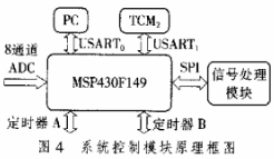 系统控制模块主要由MSP430单片机来实现。MSP430系列是一个16bit、具有精简指令集、超低功耗的混合型单片机,适于电池应用的场合或手持设备。笔者采用MSP430F149芯片,它集成的外设有:8通道12bit ADC,2个具有3个捕获/比较寄存器的16bit定时器、2通道串行通信接口(软件选择UART/SPI模式)等。基于MSP430单片机的具体外设资源,笔者设计了相应的系统控制模块硬件平台,原理框图见图4。