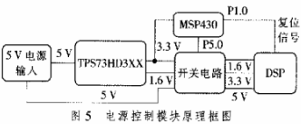 从THS73HD3XX电压调整器出来的1.6 V和3.3V电压经过由MSP430单片机P5.0口控制的开关电路再提供给DSP供电,而DSP的复位信号与MSP430单片机P1.0口相连。这种设计可以很方便地实现系统的电源控制,系统的功耗可以有效地进行控制,因为整个系统的功耗主要在DSP上,MSP430单片机的功耗很低,在不需要DSP工作的时候,可以适时地让其掉电,需要的时候再进行上电和复位。