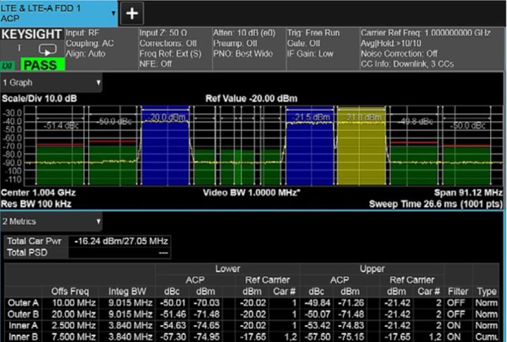 图 1.3:在现代无线系统中,当配置中包含累积的 ACLR 时,由于使用了非连续载波聚合,所以 ACPR/ACLR 测量设置可能会非常复杂。