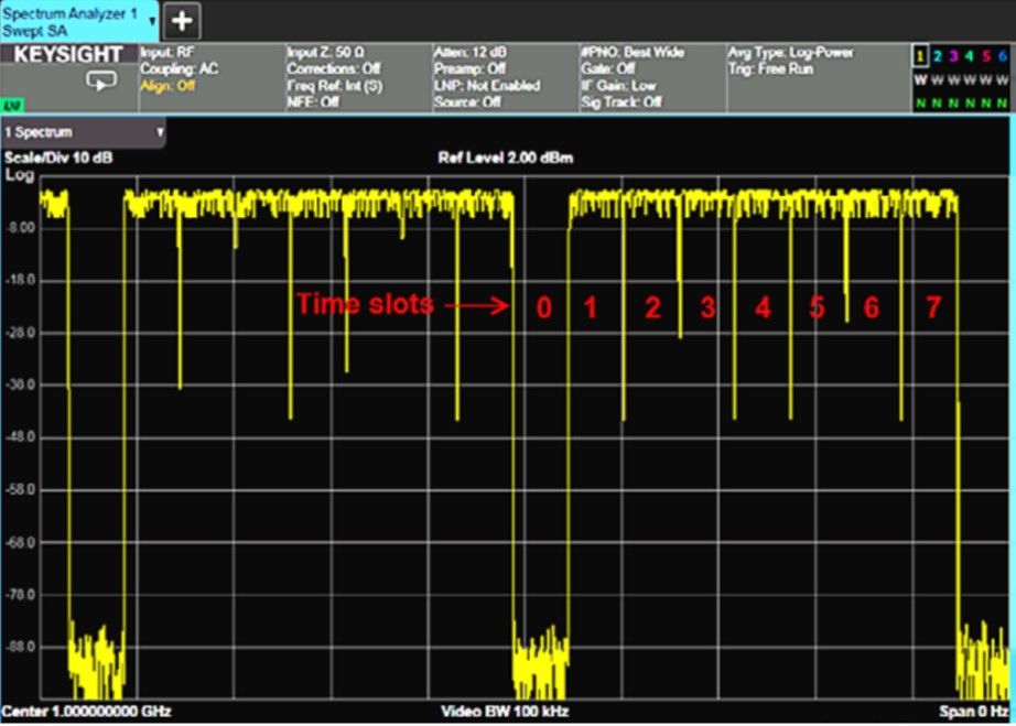 图 1.1:包含 8 个时隙的 TDMA 制式信号(在本例中,为 GSM);时隙 0“关闭”。
