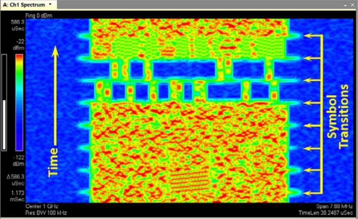 图 1.4:LTE 信号频谱图,通过对有重叠的连续信号采集结果进行后期处理而得到。符号之间转换点处的频谱扩展使您无需对符号解调,即可看到符号时序和子载波的变化。