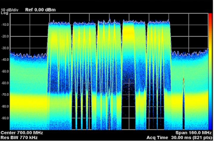 图 2.2:对这个五载波 LTE-Advanced 信号的实时频谱测量同时显示了带内和带外干扰。