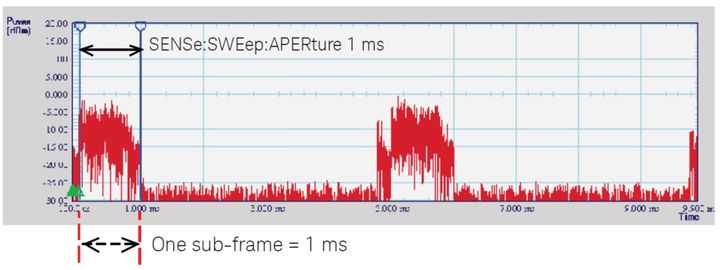 图 1.5:很多功率计都可以选择时序参数,测量不同时间点的功率。这是使用猝发脉冲平均功率设置,对 LTE 信号的一个子帧进行的测量。