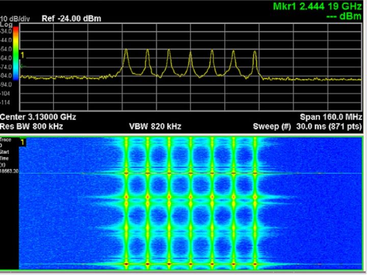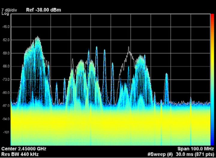 图 2.1:本频谱图显示了信号概况及其在间隔大约为 26 ms 的 2.45 GHz ISM 频段中的特性。这种高度重叠的实时测量提供了 WLAN 猝发脉冲、Bluetooth® 跳频以及微波炉泄漏的详细视图。