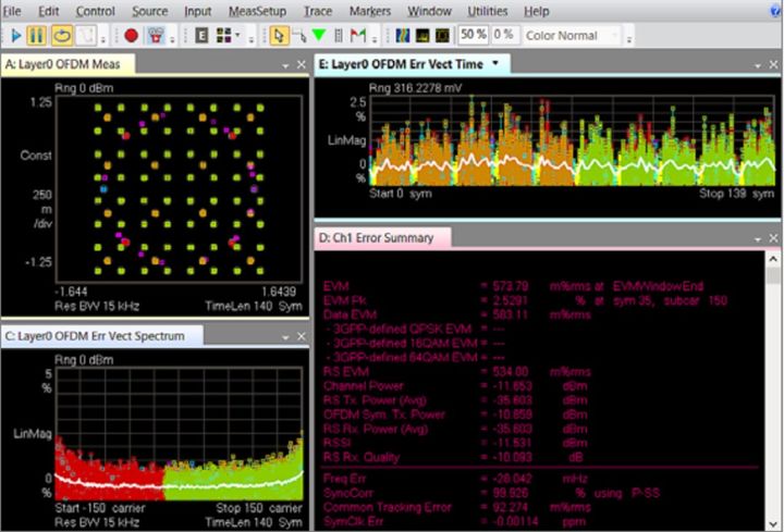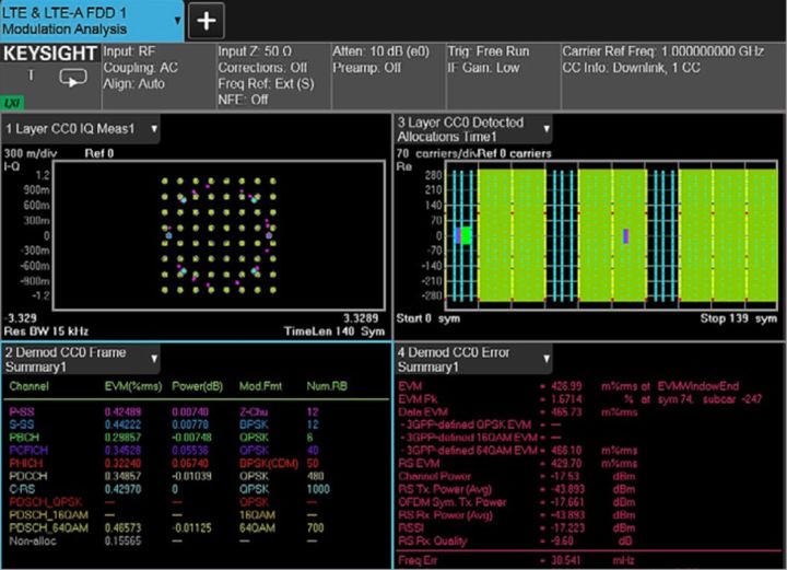 图 3.1:这些测量应用软件能够提供复合多测量显示,帮助您更全面地了解信号质量和特性。此 LTE 测量结果屏幕快照中包含星座图、检测到的分配、帧摘要以及总体误差摘要。为了便于优化和故障诊断,测量根据信道类型进行了颜色编码。