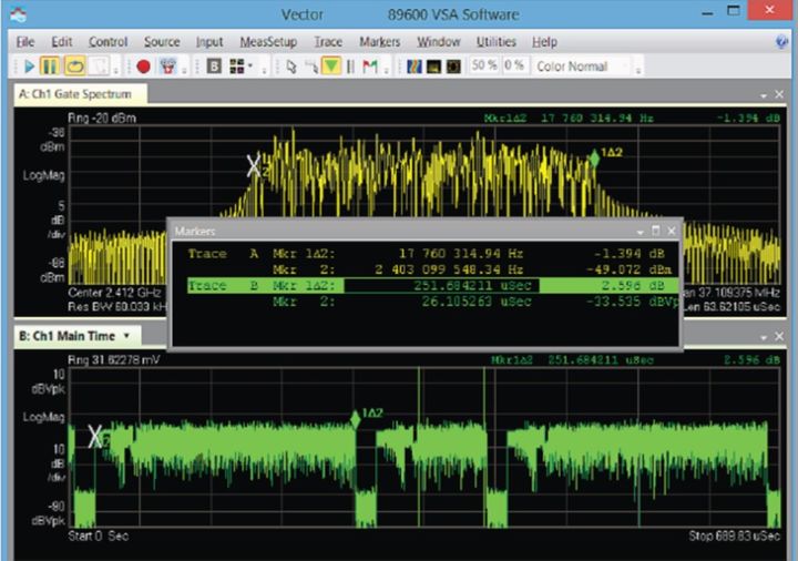 图 3.2:Keysight 89600 VSA 软件的频域和时域测量结果组合显示,其中包括带宽游标和猝发脉冲长度游标。下方迹线是信号的对数标度幅度或射频包络,包括垂直选通游标。使用该游标,可以选择指定的时间记录部分,根据该部分计算上方迹线中的频谱。时域迹线还表明所测量的帧比其他帧短。