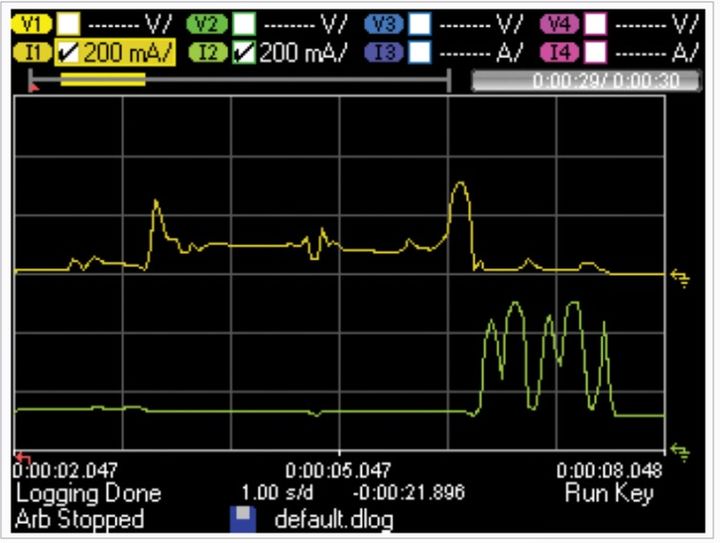 图 4.1:示波器视图(上)中显示了 30 ms 的电流消耗动态,数据记录仪视图(下)中显示了 30 s 的电流消耗动态。此类测量有助于更全面地了解器件或子系统的真实功率需求。