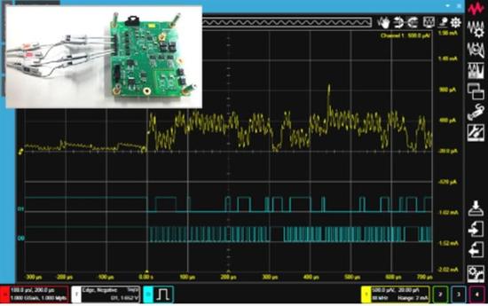图 4.2:Keysight CX3300 系列器件电流波形分析仪的专用电流传感器能够在不影响低负载电流感应能力的同时,大幅抑制高频电流噪声。这种双通道传感器采用同时双量程视图技术,实现了几乎五个数量级的动态范围。