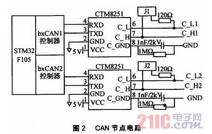 由于STM32F105内部集成了双路CAN控制器,CAN中继器的节点电路变得十分简单,其硬件电路如图2所示。