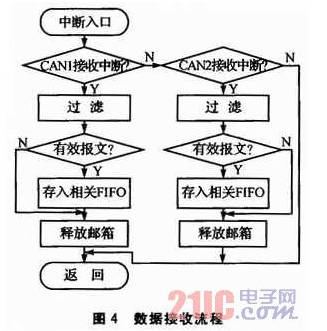 为了提高中继器数据传输的实时性,CAN报文的接收采用中断方式。所以在CAN初始化过程中应该通过调用STM32固件库函数voidCAN_IT-Config(CAN_TypeDef*CANx,uint32_t CAN_IT,FunctionalState Newstate)来开启CAN1和CAN2的中断。在接收时通过判断其标志位来确定是CAN1还是CAN2产生的中断,以此进入中断函数void CAN1_RX0_IRQHandler(void)和voidCAN2 RX0_IRQHandler(void)对收到的报文进行处理。即:在接收一个报文时,其标识符首先与配置在标识符列表模式下的过滤器相比较。如果匹配上,报文就被存放到相关联的FIFO中,并且所匹配的过滤器的序号被存入过滤器匹配序号中;如果没有匹配,报文标识符接着与配置在屏蔽位模式下的过滤器进行比较;如果报文标识符没有跟过滤器中的任何标识符相匹配,那么硬件就丢弃该报文,且不会对软件有任何打扰。数据接收模块流程如图4所示。