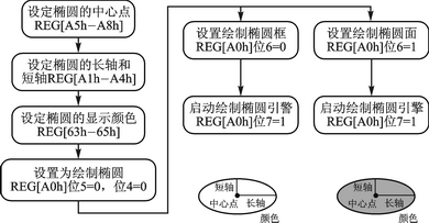 ④ 内建了直线、矩形、圆角矩形、椭圆的加速绘制引擎。以椭圆的绘制为例,在指定了椭圆的中心点、长短轴、颜色后开启绘制,RA8875会自动按所指定参数绘出椭圆。图2为RA8875用户手册[1]中给出的程序流程图。其中[65hA8h]等均为RA8875中相应的寄存器。