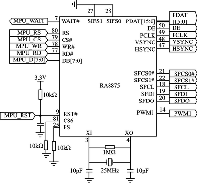 RA8875[1]是瑞佑公司推出的256/64K色TFTLCD控制器,最大支持800×480分辨率。RA8875的内部结构图略——编者注。