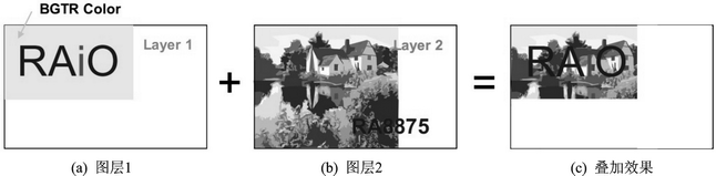 ① 480×272以下分辨率支持双图层,特别地,支持图层1的通透模显示,即设置好图层1(Layer1)的透明色(BGTR Color)后,将其叠加在图层2(Layer2)上,Layer1中原本显示透明色的部分将不再显示。其显示效果如图1所示。