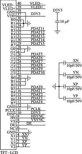 随着显示屏分辨率的增加,其所需的处理时间相应递增,在480×272像素时能达到24帧以上的刷新速度,由于人的视觉滞留效应,在这种速度下更新显示内容没有闪烁感,能被人肉眼所接受。速度指标测试结果略——编者注。在本设计中,采用驱动IC为OTA5180A的480(RGB)×272点阵TFT数字屏,图6为该屏的接口定义及接线图。