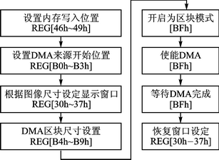 图像信息表中登记了一幅或多幅图像的信息,包括图像唯一的标识符、尺寸、图像取模数据。当需要显示或剪切显示图像时,仅需操作RA8875的个别寄存器即可将显示工作完全交由RA8875的DMA来完成。其操作流程如图8所示。