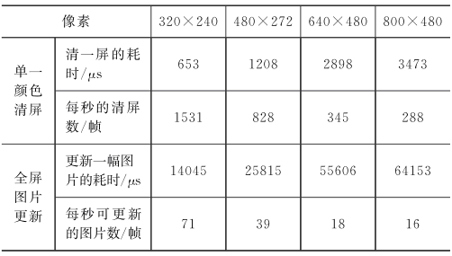 ④ RA8875的TFT驱动模块用于驱动TFT数字屏的信号,包括时钟信号(PCLK)、有效信号(DE)、垂直同步信号(VSYNC)、水平同步信号(HSYNC)、数据信号(PDAT[15:0])。通过使用STM32内部的定时器中断做精确计时,得出各种像素的TFT数字屏的速度指标,如表1所列。